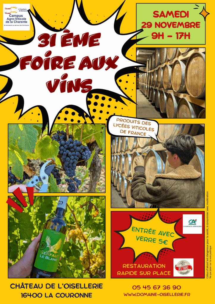 Le domaine de l’Oisellerie sert de support de formation au monde viticole et agricole charentais depuis plus d’un siècle, aux portes d’Angoulême au pied du Château de l’Oisellerie, sur la commune de La Couronne. S’étalant sur 34 ha regroupés autour du lycée, nous cultivons les cépages typiques de la région : Ugni Blanc, Montils, Colombard, Merlot …. Afin de produire notre gamme de pineaux, cognacs et vins de pays charentais.